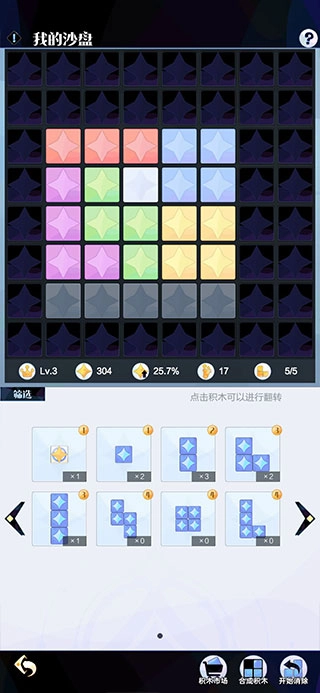 沙盘是把你所有练度转化为实际战斗力的工具,我们挑选下方的积木(若没有可通过邮件、剧情等方式获取)将整个沙盘拼满(拼不满就把最小的积木全部合成),如此便能拓展“战场”,接着点击右下角开始消除,尽可能发挥实力获取更多星星,战力就会不断提升啦。