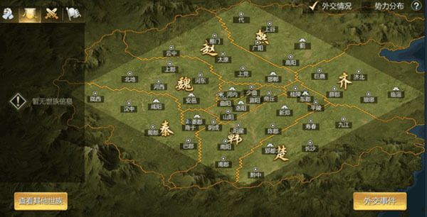 外交:可以查看天下外交关系,可以与其他世族进行同盟、宣战、附属等外交操作。