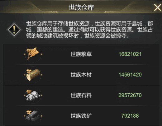 世族专属的仓储设施用于存放该组织的专用物资,这些物资能供给由世族掌控的各类建筑使用。成员通过物资捐赠的方式可以为世族积累这类专用资源,而当世族所占据的城池遭遇破坏时,这些资源可能会被敌方夺走。