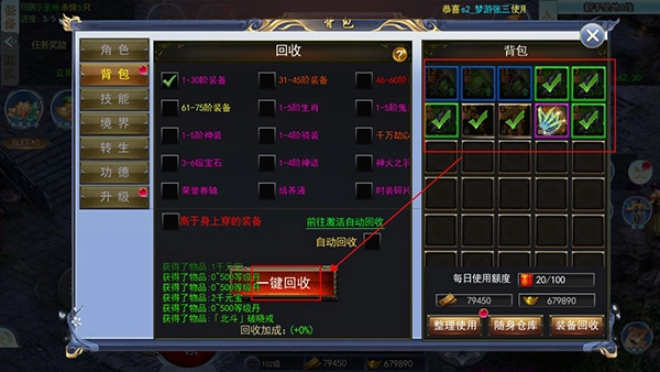 4、过多的低级装备也可以进行一件回收,获得大量元宝奖励。