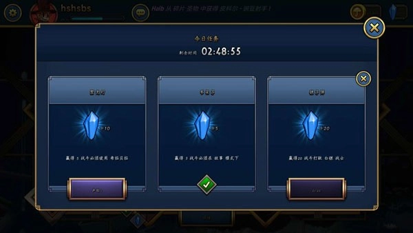 1、任务:在游戏大厅页面点击“任务”选项,即可查看每日任务内容。系统每日会发布三个任务,完成这些任务后,玩家就能领取对应的宝石奖励。