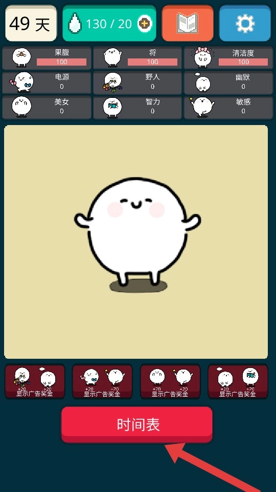 1、进入游戏界面后,先查看【49天】的进度以及各项数值的状态,接着点击【红箭头】所指向的【时间表】按钮。