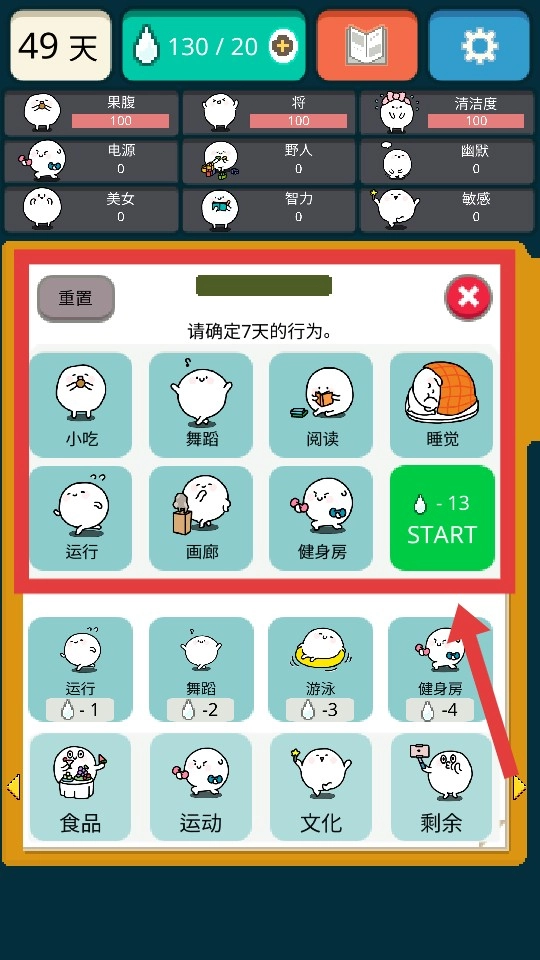 4、完成7天行为安排,确认消耗数值合理后,点击【红箭头】指向的【START】按钮开始执行日程。