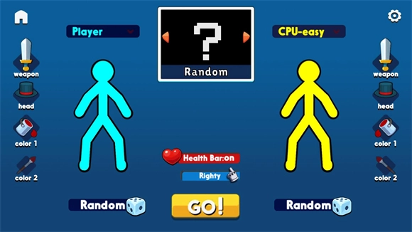 2、选择对战模式后会让你定制自己的角色,你可以选择武器、装饰、颜色来定制自己的火柴人,全部选好后点击GO开始战斗。