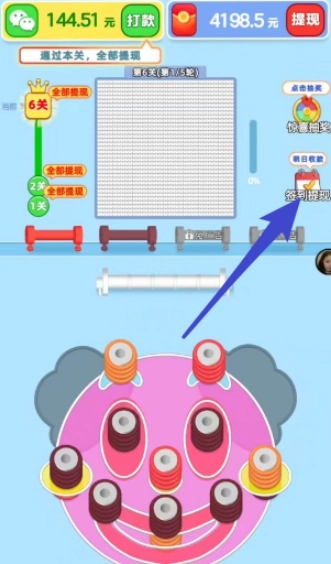 1、在游戏里,我们只要点击任意一根毛线,就能把它放到对应颜色的柱子上。