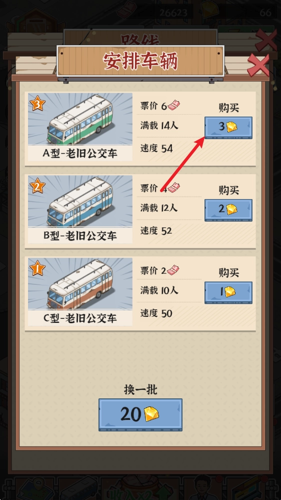 2、选择一辆公交车开始运营,等级越高的公交车带来的收益也越高。