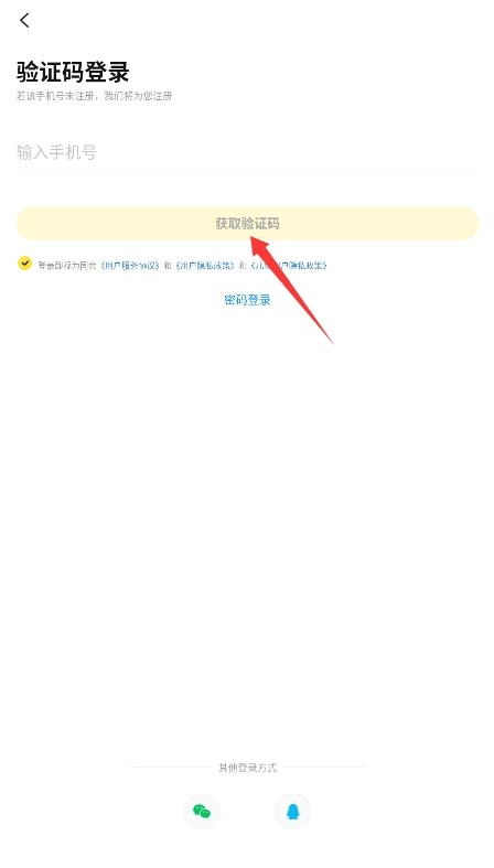 1. 输入手机号码以获取验证码,在勾选同意服务条款后,系统会自动完成账号登录验证。