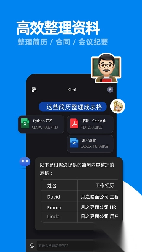 4、整理资料:无论是堆积如山的发票,还是复杂冗长的会议记录,Kimi 都能智能识别整理,自动提取关键点,让资料整理不再繁琐,信息一目了然。