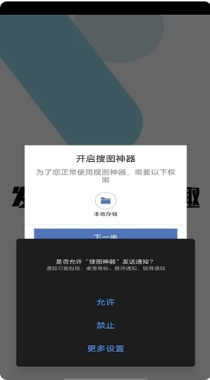 1、首先在本站搜图神器并运行进入,首先需要点击允许,完成桌面角标、悬浮通知、锁屏通知的授权