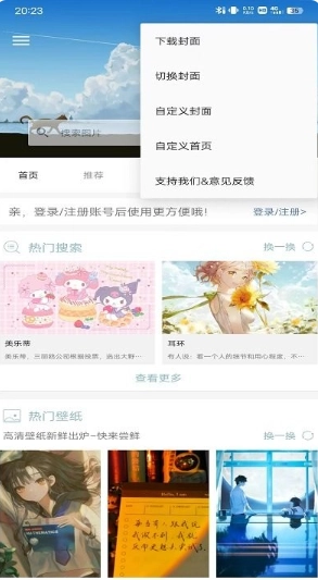 5、在首页的右上角,点击三点会跳出小界面,这里拥有封面、切换封面、自定义封面、自定义首页、支持我们/意见反馈等