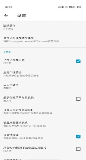 7、点击个人中心左下角的设置按钮,即可进入软件设置界面。在此界面中,你可以进行清理缓存、自定义图片存储文件夹、设置个性化推荐内容以及选择应用主题色等操作。