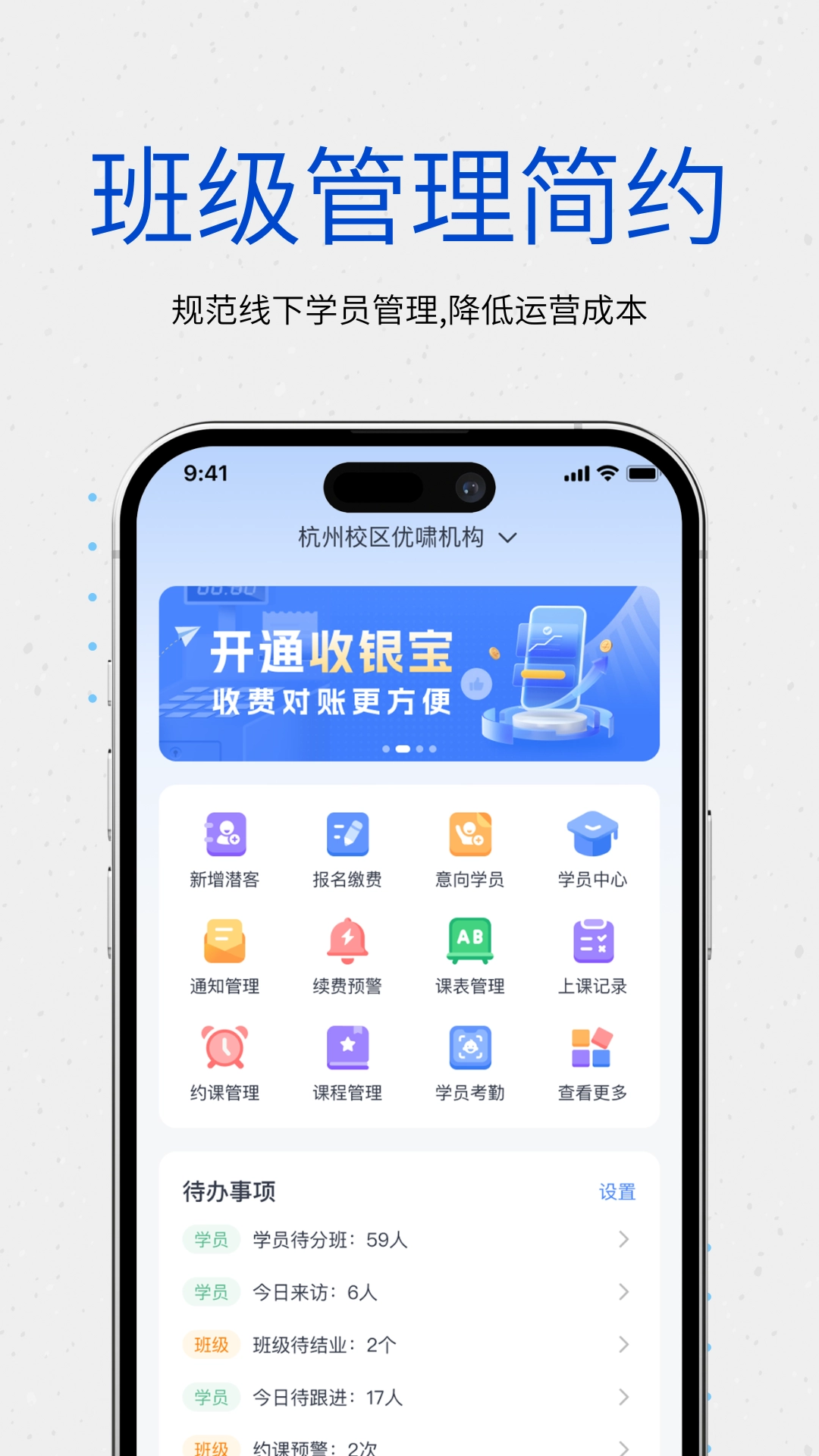 ①收款码自动报名:学员扫码自助缴费,支持多种收款设备;