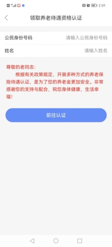 点击“养老待遇领取资格认证”后界面如下。输入需要认证人员的身份证号码及姓名(可为其他人员认证),点击“前往认证”: