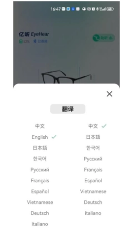 1、借助EyeHear,用户能够自主挑选想要翻译的目标语言,能轻松地把中文翻译成其他各种语言,助力人们在旅行或者国际交流场景下跨越语言障碍。
