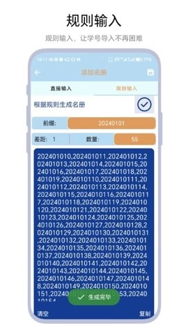 1、用户除了能够手动输入名册以及通过Excel导入外,还能够依据不同的差值生成特定数量的名单,并且可通过设定前缀,以便于查看历史保存的名册。