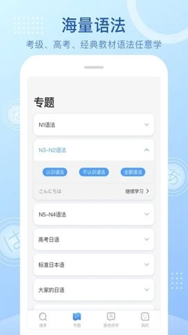 学习模块:设有多个学习模块,涵盖日语的基础语法、句型、时态等内容,用户可以根据自己的需求选择学习。