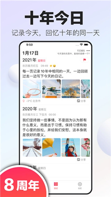 2、十年日记设置心情、天气等功能,方便您随时查询。