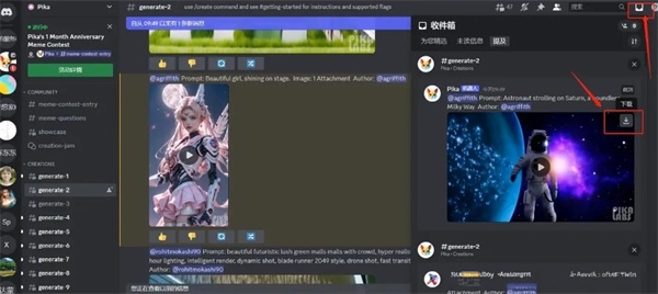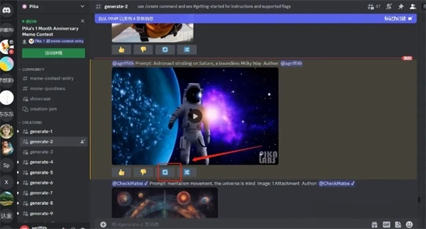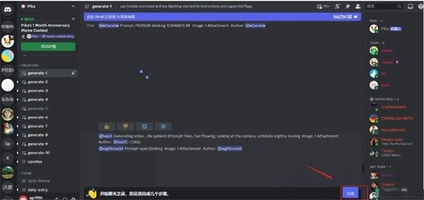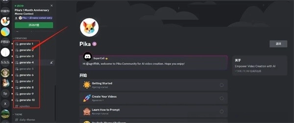 2、看到图示页面,说明已成功加入Pika,在Discord频道的左侧找到 “generate” 子区,随意选择一个点击进入。