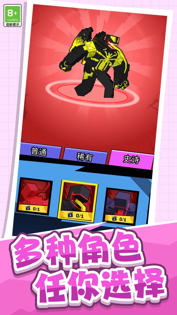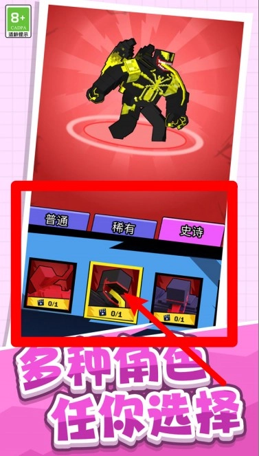 1.角色皮肤系统:点击下方分类标签可选择普通、稀有或史诗角色皮肤,每种皮肤都有独特造型与战斗视觉表现。