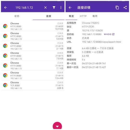 左图通过搜索框过滤特定目标主机,可以看到这些连接目前已经是关闭状态(CLOSED),因为用的是短连接场景;任意点选一个连接可以看到概览信息,包括连接持续时间,访问的URL、协议、进程和进程ID,以及产生的流量大小和载荷长度: