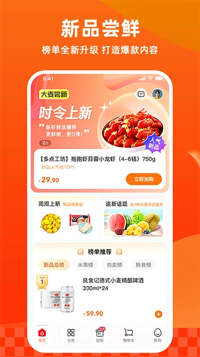 1、商城里日常生活用品应有尽有,涵盖新鲜果蔬、零食酒饮、米面粮油等各类,能够契合用户多样化的需求。