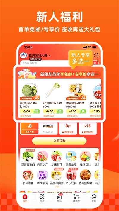 3、在这里小编选择一个超市为例了,选择后进入主页面。超市中的商品和实体店中是同步显示的,有些地方,例如在北京,也可以购买一些高端进口的生鲜产品,有的时候会有很多优惠,很便宜。