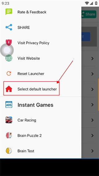 3、往下划找到select default launcher选项点击。