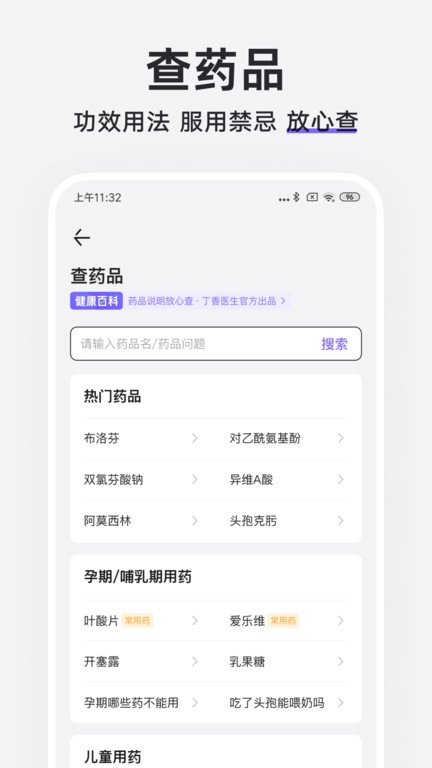 2.强大的检索能力,除了可以查询各种疾病、药品,还能查看医保信息、药价等信息,以及识别虚假的医疗广告。