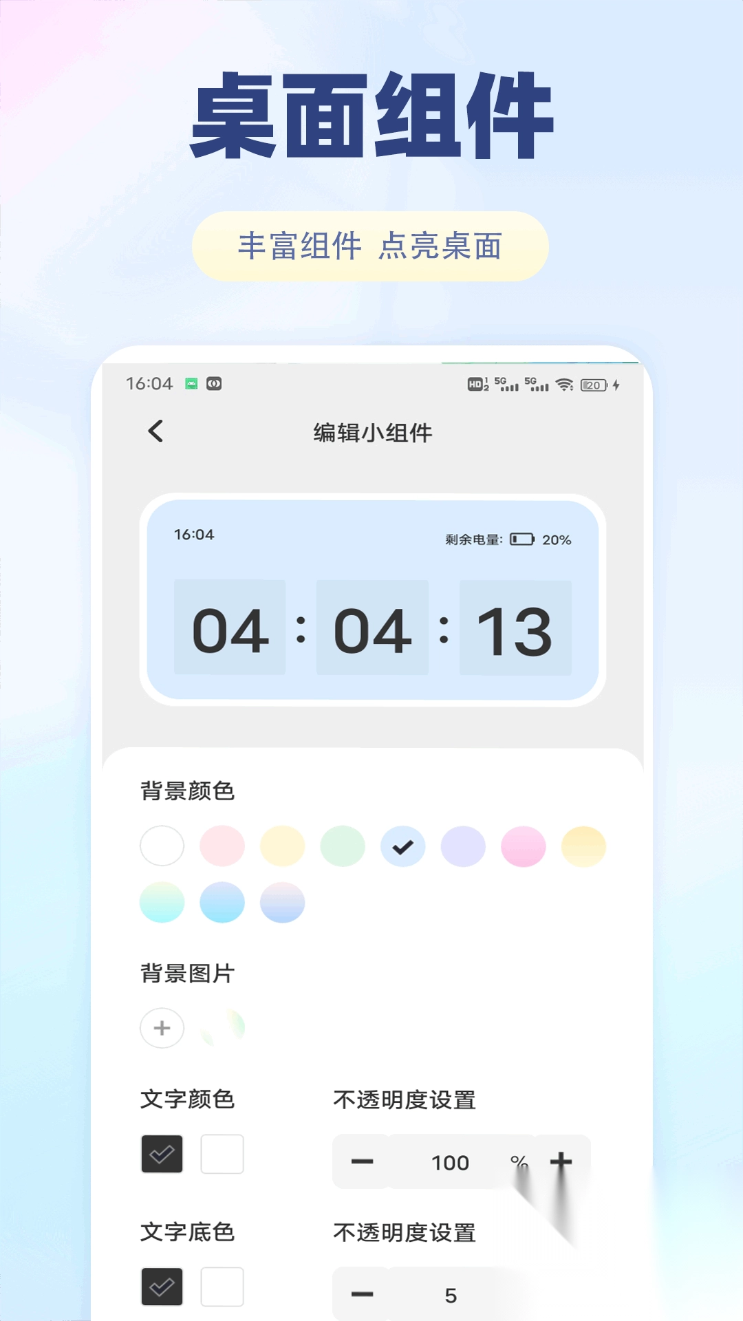 3、能调整组件的背景颜色、图片、文字颜色及不透明度等,实现高度个性化的桌面设计。