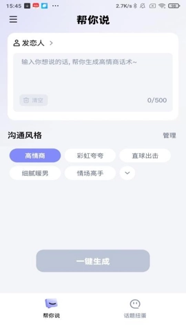 1用户仅需输入期望表达的内容,系统即刻就能快速生成各式各样的高情商话术,以提供给用户挑选。