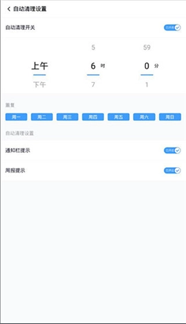 4、在设置页面,你可以对自动清理功能进行开关、设置清理时间、设置清理周期、还有开启/关闭提示的功能。