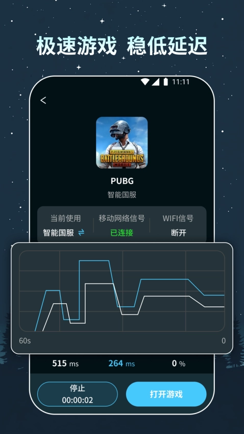 支持普通模式/高级模式两种加速模式的切换,通过WIFI+4G双通道只能切换, 让您在地铁/公交上也能流畅对局。