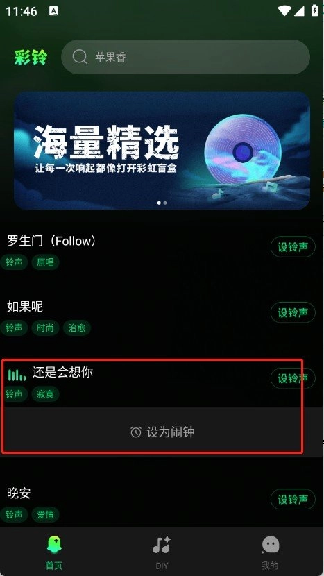4、直接点击喜欢的铃声,可以设为手机铃声也可以设为闹钟铃声。