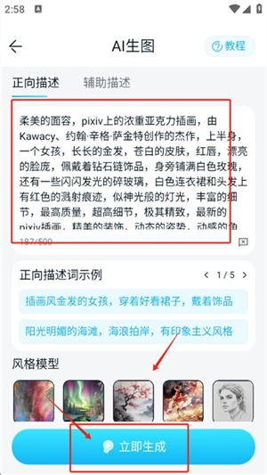 4、点击AI生图进入,输入心中想象的画面,选择喜欢的风格模型等,点击立即生成就能快速创作