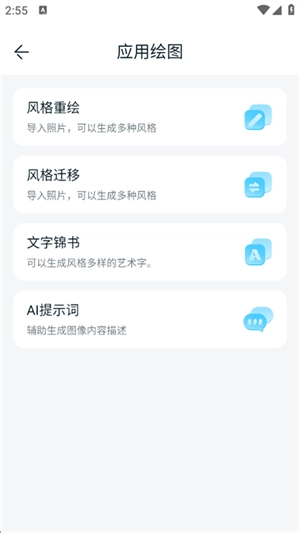 5、在应用绘图页面还提供了风格重绘、风格迁移、AI提示词等功能服务
