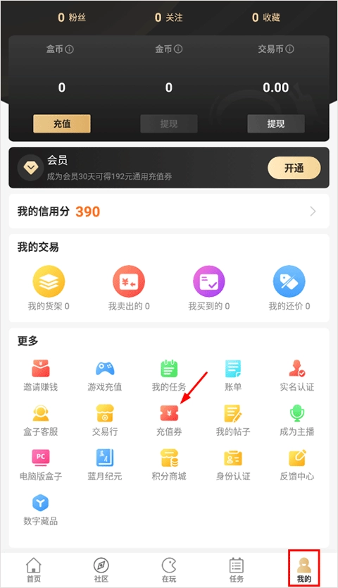 1. 开启996传奇盒子,进入“我的功能”模块,选中充值券。
