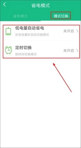 3、点击【模式切换】选项进行自动设置,一旦电量降低即可启动省电模式,帮助延长使用时间。