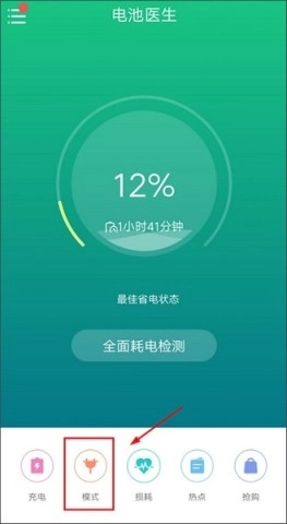 1、打开最新版本的金山电池医生,点击首页下方的【模式】。