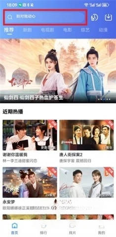 1、打开软件,点击搜索框,输入想看的电视剧名称,进入该电视剧页面。