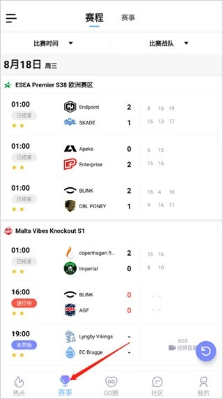 1. 打开软件,点击底部的【赛事】,就能查看不同时间段的赛事。