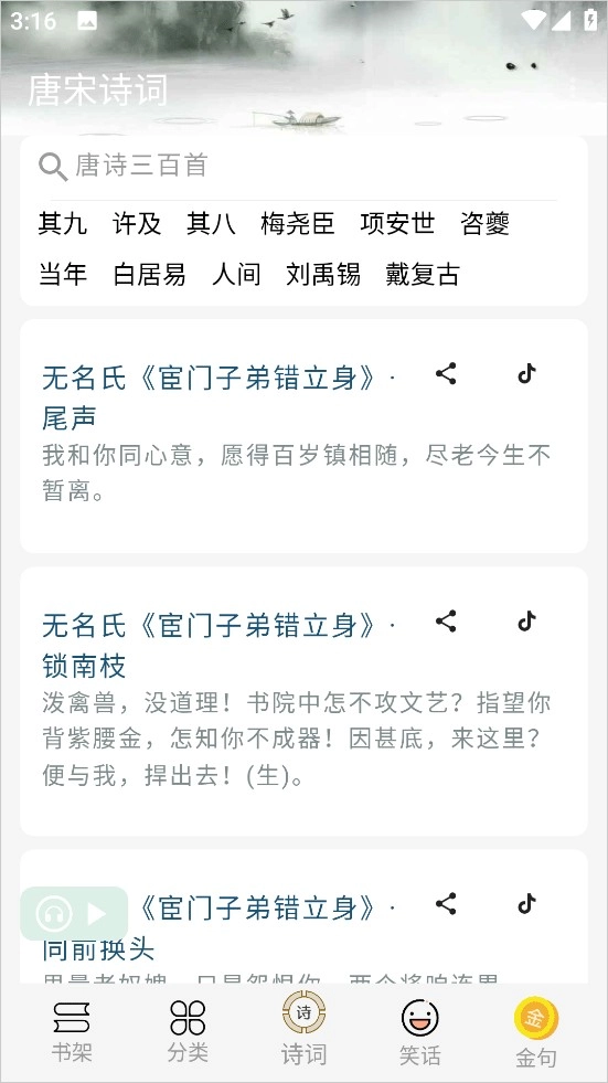 - 涵盖唐诗宋词元曲、曹操诗集等经典文学作品,以及幽默段子、歇后语、励志名人名言等丰富素材,一键分享至抖音,让更多人感受文化的魅力。