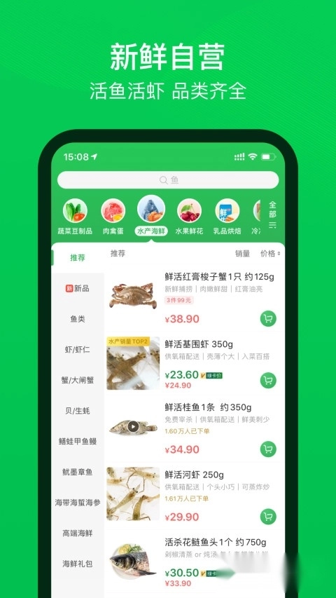 4、涵盖蔬菜、豆制品、水果、肉禽蛋、水产海鲜、米面粮油、休闲食品等丰富类别。