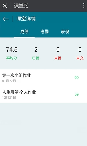 2、点击“课堂详情”,进入课程详情页,即可查询作业的批改状态,并统计出平均分,以及已批,未批,未交的次数;