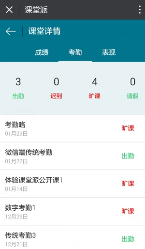 3、在考勤模块,显示每次考勤的状态,并统计出学生出勤,迟到,旷课,请假的次数;