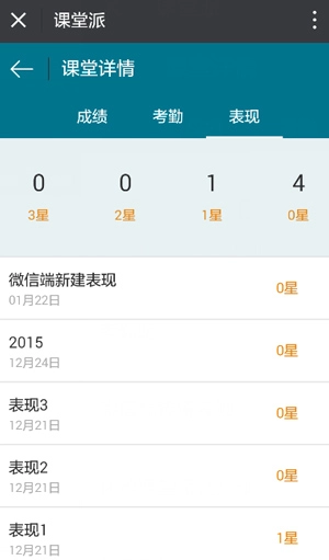 4、在表现模块,显示每次表现的状态,并统计出学生3星,2星,1星,0星的次数。