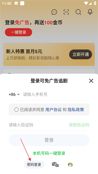 3、在登录窗口,点击密码登录,切换到密码登录界面。