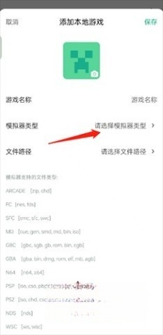 3. 输入游戏名称,选择模拟器类型,然后选择文件路径。