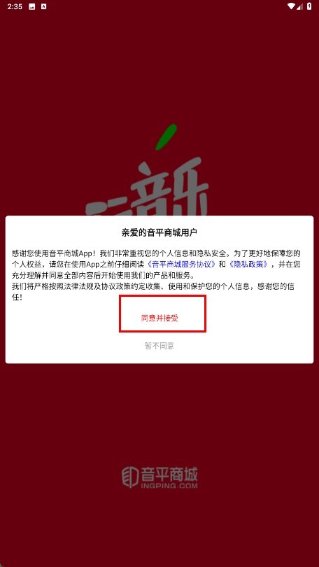 1、点击【同意并接受-功能按钮】,确认音平商城服务协议和隐私政策。