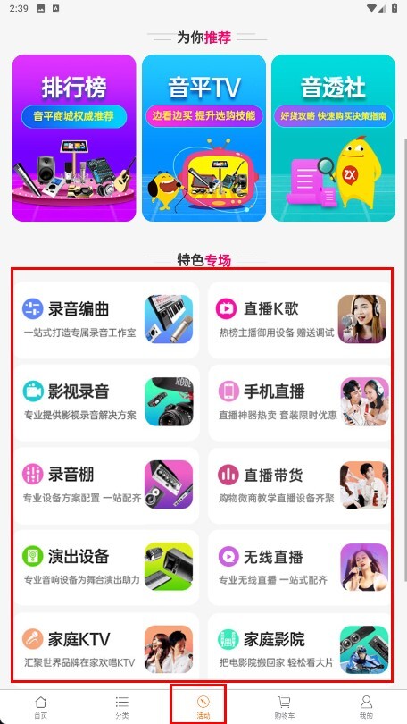 4、点击底部的【活动】功能按钮,进入活动页面后,就能查看特色专场里的录音编曲、直播K歌等分类内容。
