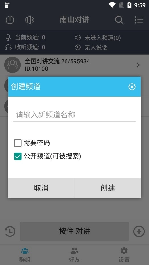 2、之后输入频道名称,进行密码或者公开频道的设置(这个能够根基自身需求进行设置)。
